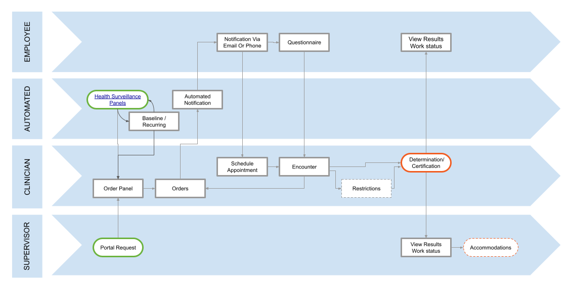 To assist in the recordkeeping requirements for occupational health surveillance, the Enterprise Health system provides many time-saving features and functionalities. With regular medical surveillance, the necessary documentation and compliance reporting can easily be generated and automated through data overlay technology on necessary forms, as well as through encounter protocols and configured print definitions.
