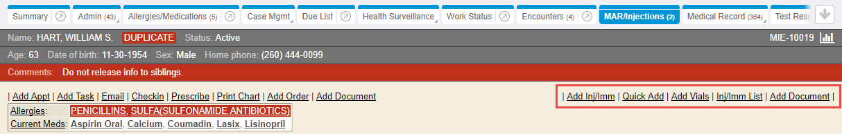 The Add Inj/Imm link allows users to add injections/immunizations, upon administration. The Injection/Immunization screen will load, where all necessary fields can be filled out according to the medication or vaccine being provided.