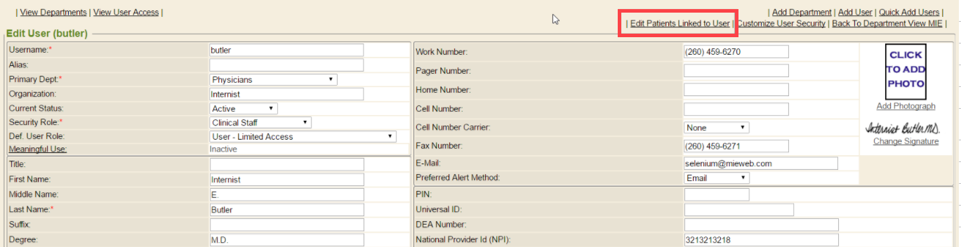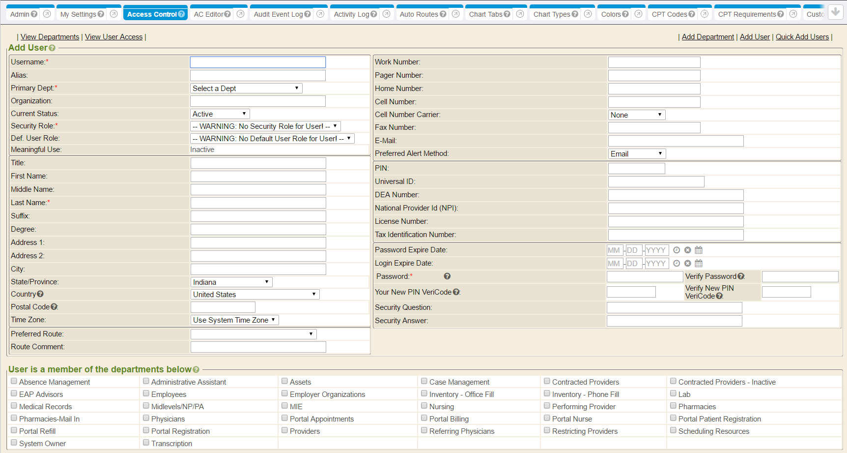 Users and providers utilizing the Enterprise Health system can be added manually, much like how locations are added. The manual method, however, is typically used in WebChart systems. In Enterprise Health systems, the workflow tends to use charts for every patient and user. In these cases, the Enterprise Health system may already be set to create a user when a chart is registered manually (or via an HR interface), by way of the Enable PUR Routine system setting, where the correct relationships can then be established between the chart and user, for portal functionality and other modules, as needed. If the Enable PUR Routine system setting is enabled, users would never add additional users manually, using the steps below. Users would need registered as a chart in the system first, then their user profile (that gets autocreated via this enabled system setting functionality) may be edited and updated from the Access Control tab of the Control Panel. From here, after locating the user, simply click the Edit link in the Options column, and update all necessary information.