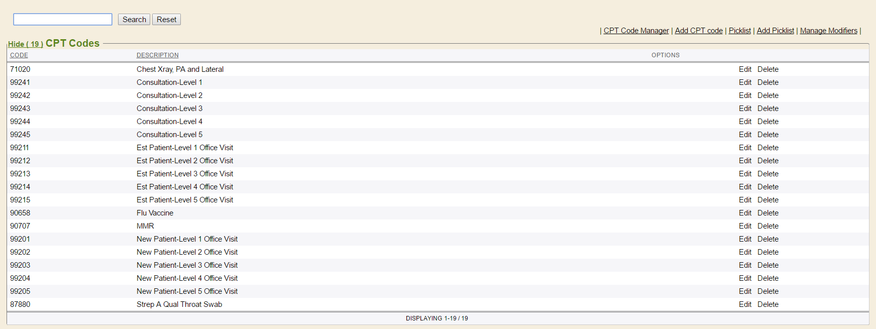 Modifiers can also be managed from the Billing Codes chart tab of the Control Panel. To edit or update the modifiers list, simply click the Manage Modifiers link in the upper-right corner. This allows the modifier picklist to be managed, controlling what is seen for descriptions and selections. Also, clients with an established billing interface will be able to send Billing codes and modifiers to their PM system, as needed.