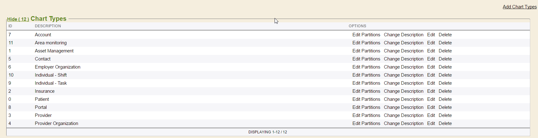 Chart Types are an important concept in Enterprise Health . Chart Types are used to differentiate between types of records in the system, allowing for different chart tabs, as needed. These should only be managed by a Deployment Consultant. To view chart types, navigate to the Chart Types tab in the Control Panel.