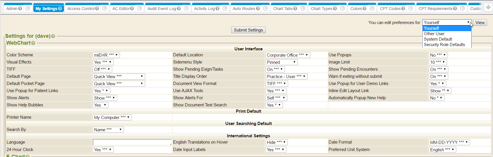 - Default Page - Select a sidemenu option as the landing page, upon login (e.g., Default to the Quick View or E-Chart page).